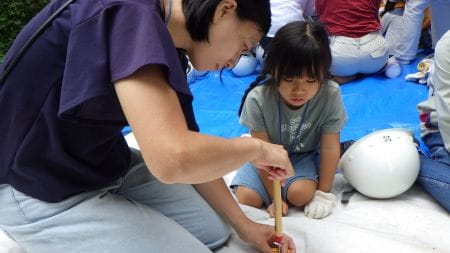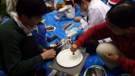 最後は広場に戻り、みんなで竹水鉄砲づくりを行いました!