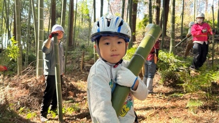 みんなでお昼ご飯を食べた後は、竹クラフトとヒノキの玉切り体験を行います。