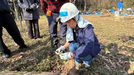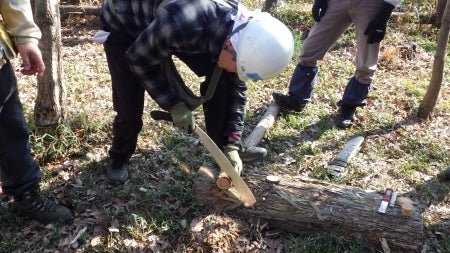 続いて、ヒノキの玉切り体験の様子です。